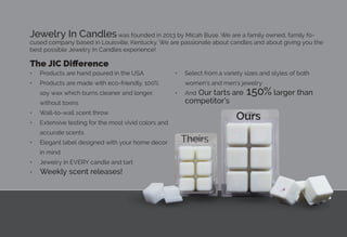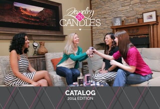 This catalog introduces Jewelry In Candles, a family-owned company that hand pours soy wax candles and tarts in the USA. The catalog describes the company's commitment to quality and includes sections featuring their scented candle and tart options across various scent categories like Sippable Scents, Enticing Desserts, Floral Bouquets, and more. Product details like sizes, prices and scents are provided for over 50 candle and tart options. Burning and care instructions are also included to help customers get the best experience from Jewelry In Candles products.