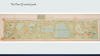 Central Park was the first landscaped public park in the United States. It was designed in the 1850s to offer New York City residents a respite from the city. The park features various landscapes, structures, and activities throughout its 843 acres. Some highlights include Bethesda Terrace, Bow Bridge, Belvedere Castle, Conservatory Garden, and Wollman Rink. The park hosts various seasonal activities like concerts, plays, skating, sledding, and playgrounds to attract visitors year-round. A wide variety of plants, rocks, and soil were used to create Central Park's diverse landscapes.