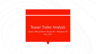 This document analyzes shots from the "Jigsaw Official Movie Trailer #2" through the lenses of mise-en-scène, editing, camerawork, and sound. It examines 15 shots, describing the techniques used and how they build tension, foreshadow plot points, and position the audience. Key techniques highlighted include the use of slow pacing contrasted with sudden action to build tension, a steady-cam shot in a graveyard to create an unsettling feeling, and close-ups of objects that represent the film's motivation. The document concludes by noting techniques the author could apply to their own teaser trailer.