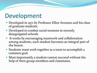 The jigsaw technique was developed in 1971 to reduce racial tensions in desegregated schools. It encourages cooperation by assigning each student a part of a topic to become an "expert" in. Students then teach their parts to classmates in "expert groups" before returning to original groups. Benefits include improved learning, attitudes, self-esteem, and achievement. It works best for topics that can be divided into parts where each student teaches others. Potential downsides include some students dominating discussions or not learning all aspects equally.