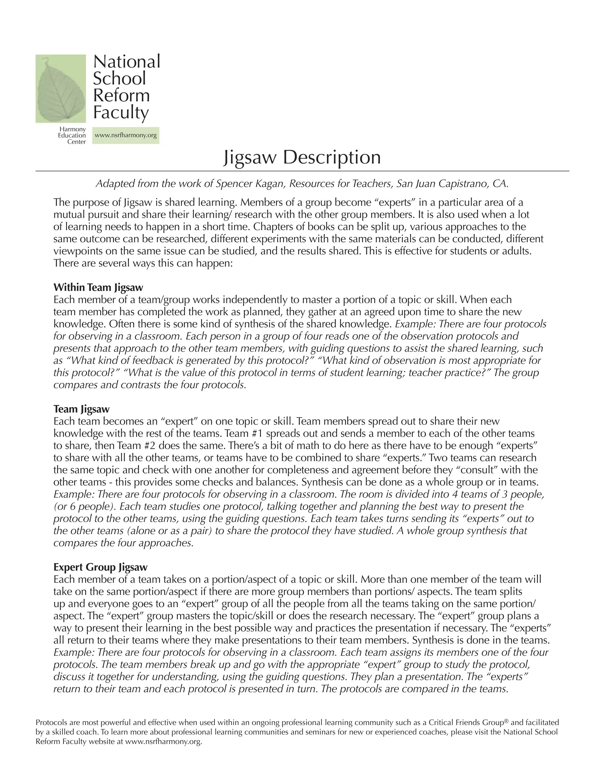 The document describes different methods for using a jigsaw technique for shared learning. Jigsaw allows groups to divide up topics so that each member becomes an "expert" in their area and then shares their learning with the rest of the group. It describes three specific jigsaw methods: within team jigsaw where experts are within each group; team jigsaw where whole groups become experts and share across groups; and expert group jigsaw where experts from different groups convene and then report back to their original teams. The goal of jigsaw is for all participants to gain exposure to all topics or skills through peer-to-peer teaching.
