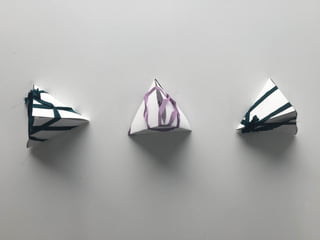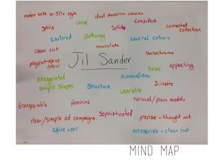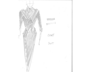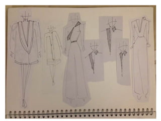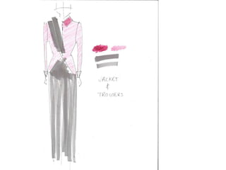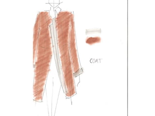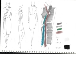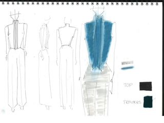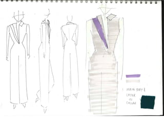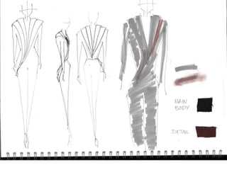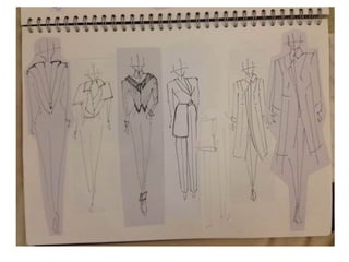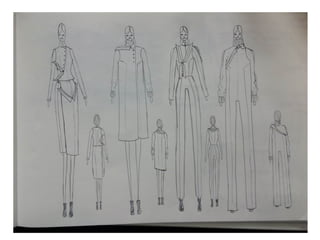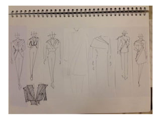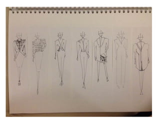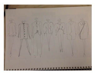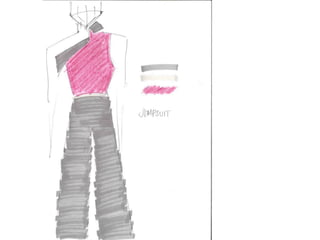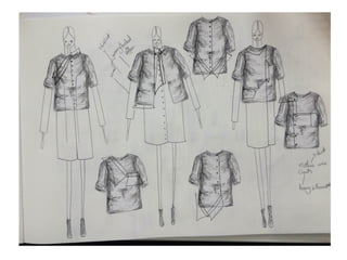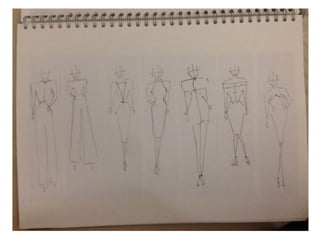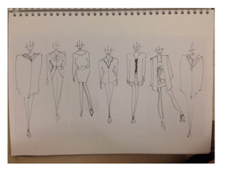 The document outlines the design process for a fashion collection, including developing a color palette, fabric selection, and design iterations to a final collection showcased on the catwalk with disruptive smoke and music. Marketing of the collection will include an ad campaign.