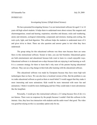 This document summarizes and reviews the educational software "Investigating Science 2". It is intended for high school students aged 11-14 to learn about various science topics. The software provides lessons, trivia, and question/answer games. However, the reviewer notes it can feel boring and lacks interactivity. While educational software is popular for helping kids learn enjoyably, this particular program would benefit from being more interesting, with more animations and adventure. The reviewer gives it a 2.5 rating, noting it is not well-known and has audio and interactivity issues.