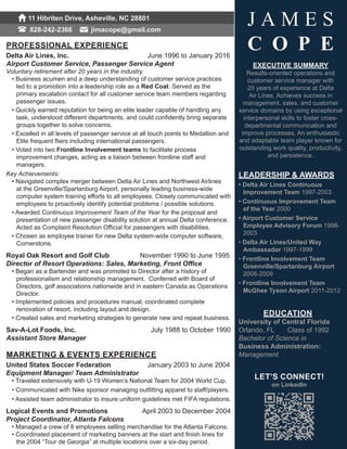 The document provides a summary of James Cope's 20 years of experience in customer service and operations management at Delta Airlines. It highlights his leadership roles, achievements improving processes, and skills in handling customer issues and bringing groups together. It also lists his education in business administration and additional relevant experience in resort operations and sports event management.