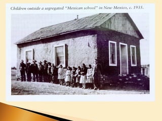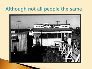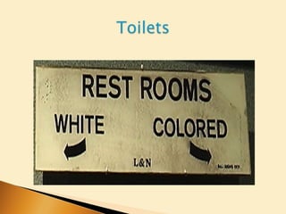 The Jim Crow laws legalized racial segregation and discrimination against African Americans in the United States. This included segregating public schools and facilities, restricting African American voting through poll taxes and literacy tests, and maintaining segregation in public transportation. The Supreme Court upheld the constitutionality of racial segregation under the "separate but equal" doctrine with its 1896 Plessy v. Ferguson decision, allowing Jim Crow laws to spread throughout the Southern states and some Northern states as well.