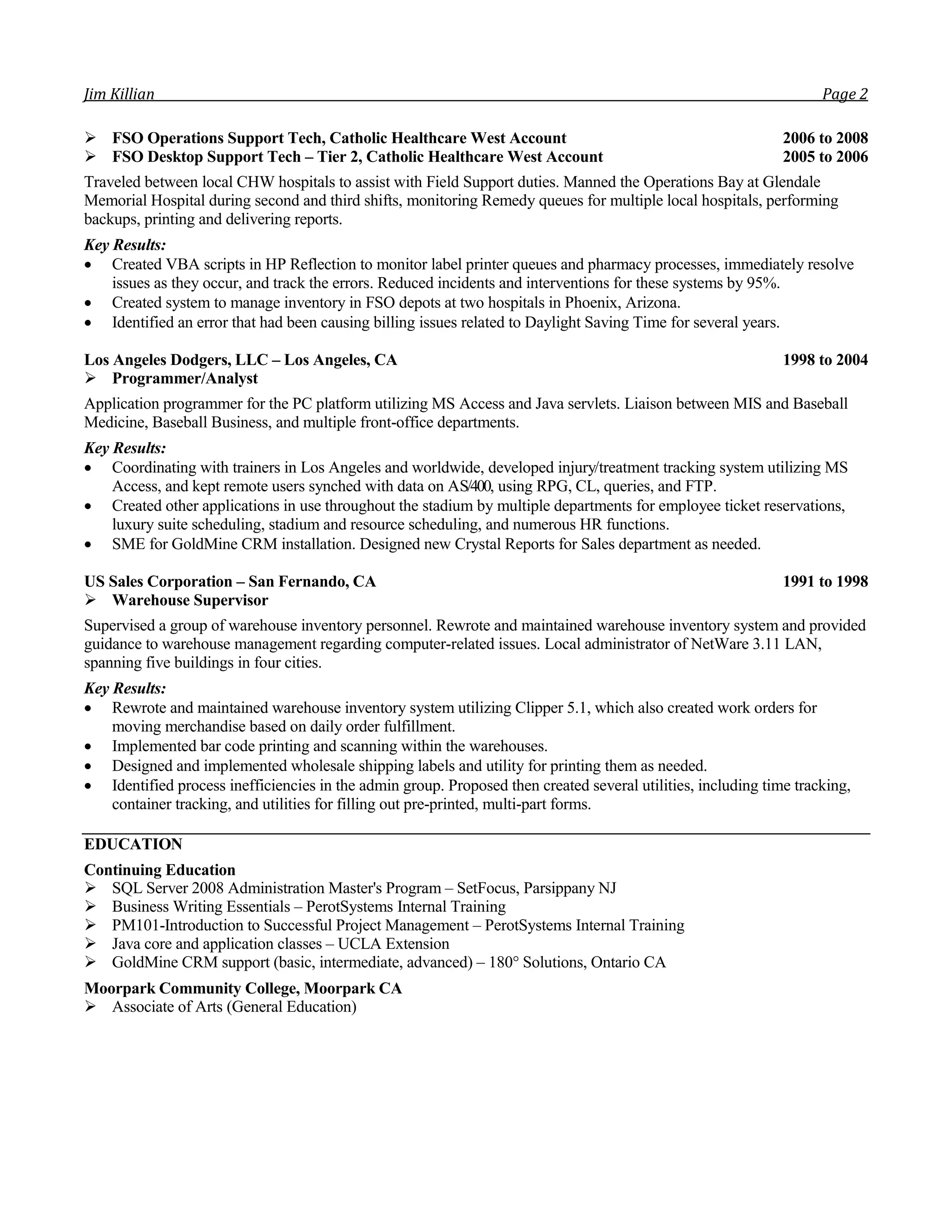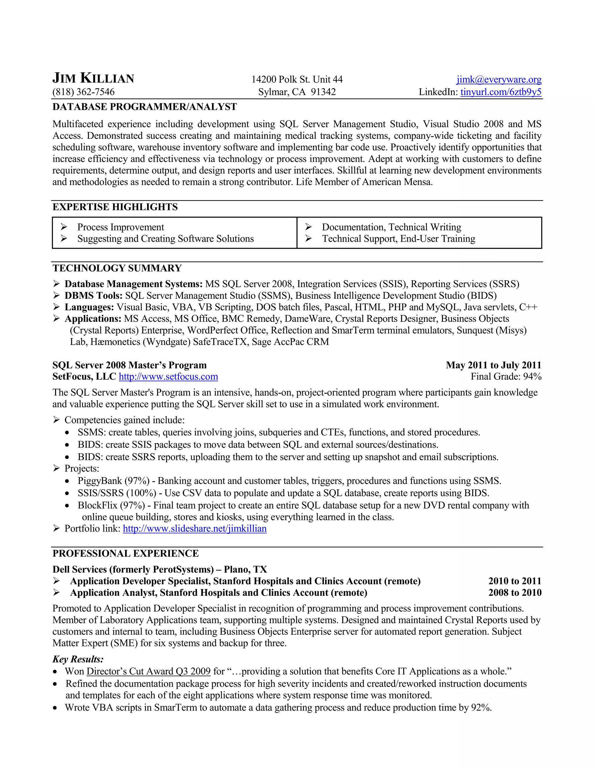 Jim Killian has over 20 years of experience developing databases and software solutions using technologies like SQL Server, Visual Studio, and MS Access. He has created medical tracking systems, ticketing systems, inventory management software, and implemented bar coding. Jim is skilled at requirements gathering, output design, and creating user-friendly interfaces. He has a proven track record of identifying process improvements through technology and received recognition for his contributions.