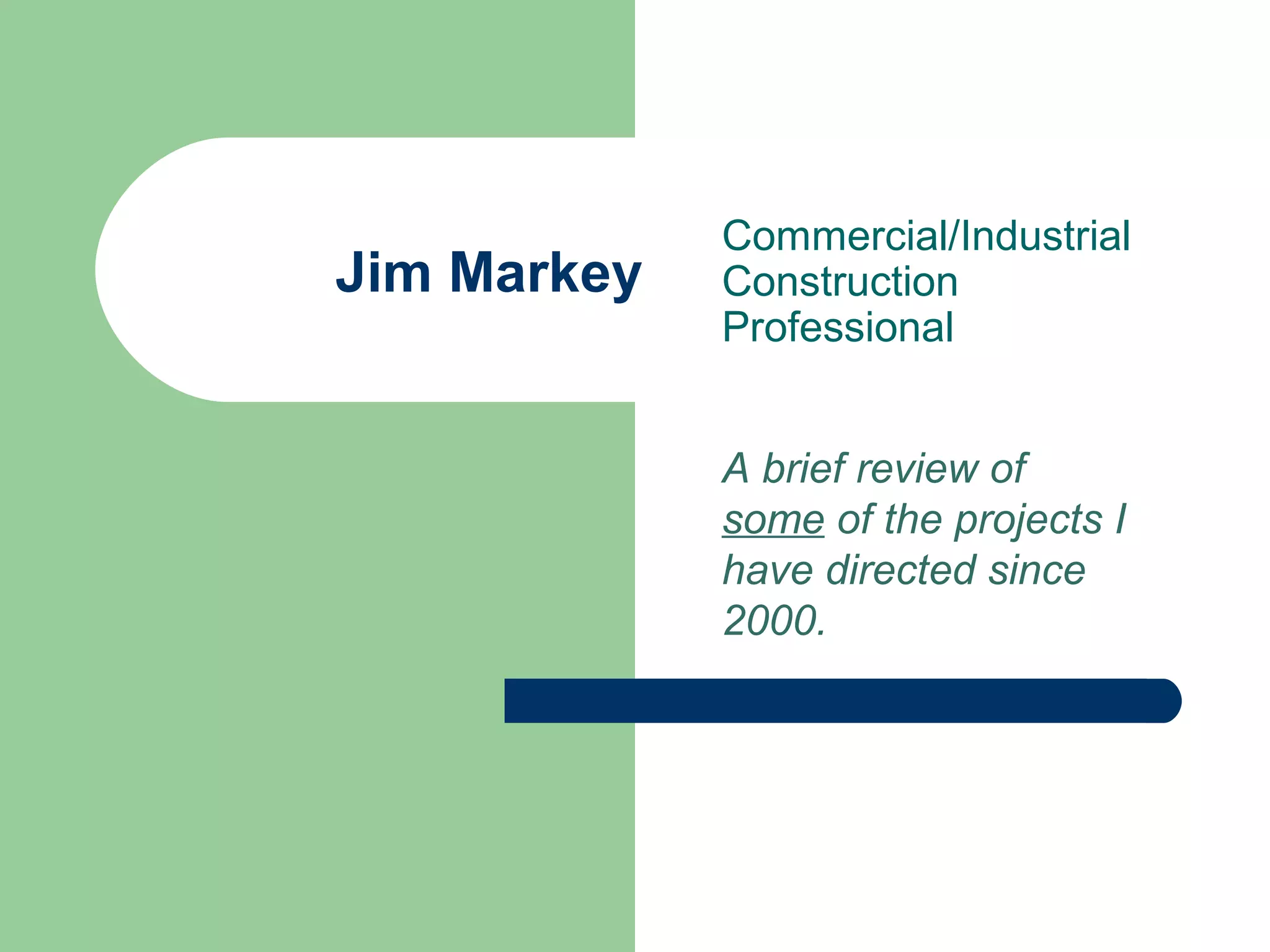 This document provides a summary of commercial and industrial construction projects directed by Jim Markey since 2000. It includes details on several FedEx distribution centers built between 2006 and 2011 in locations such as Grand Rapids, MI, South Brunswick, NJ, and Orion Township, MI. It also summarizes projects such as a Baptist church expansion in Kansas City, MO in 2003, a bowling alley in Blue Springs, MO in 2001, and a new cement production facility for LaFarge in Sugar Creek, MO in 2000. The document consists primarily of photos from these projects along with brief descriptions of their size, costs, and key features.