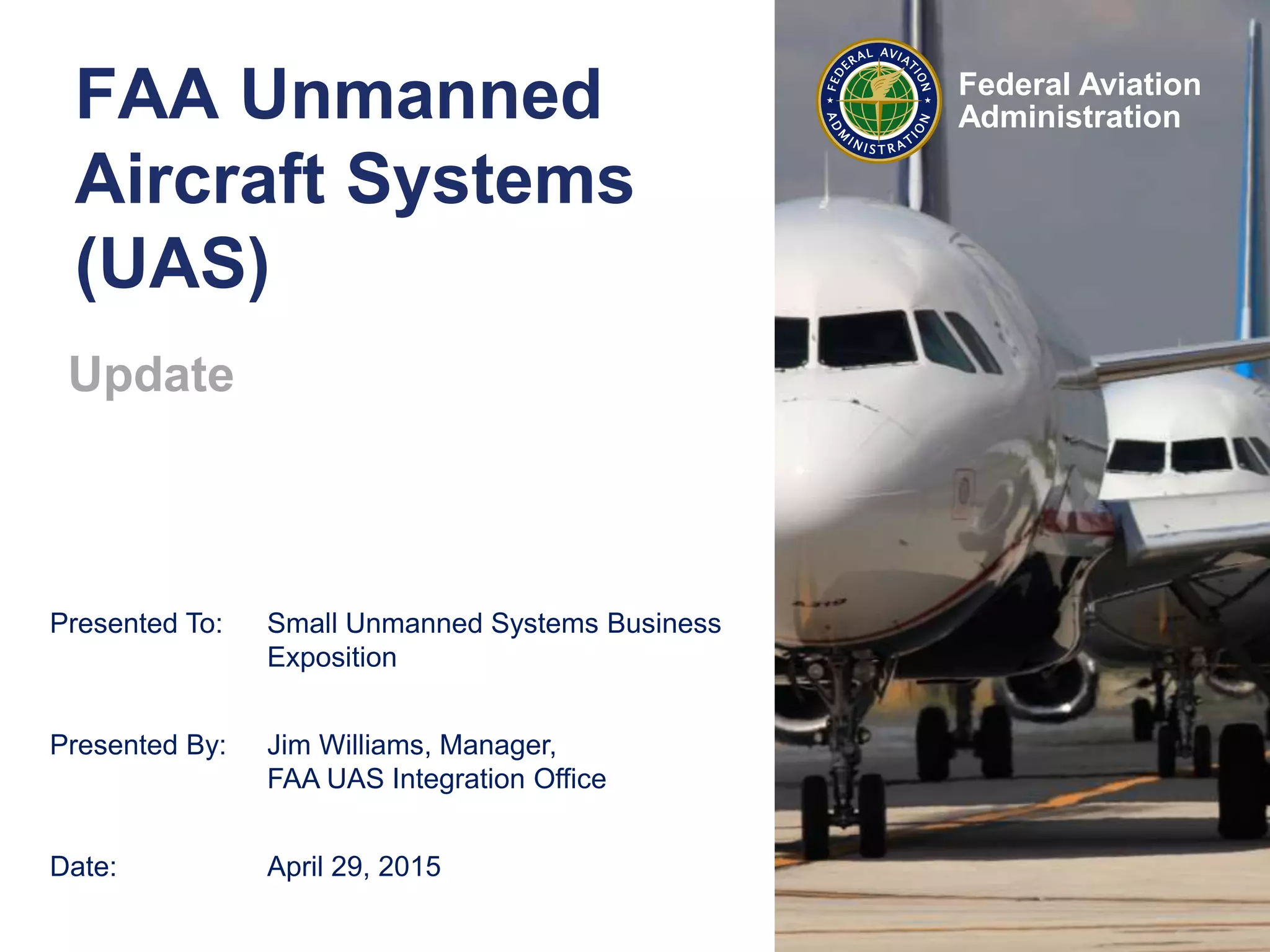 The document summarizes the FAA's current approach to regulating unmanned aircraft systems (UAS) and provides an update on recent developments. It outlines the different authorization requirements for public entities, civil operators, and hobby/recreational flights. It also describes the FAA's Section 333 exemption process, the proposed small UAS rule, guidance for model aircraft operators, and the agency's focus on education and compliance over enforcement. The presentation concludes by teasing upcoming next steps from the FAA in regulating UAS and integrating them into the national airspace system.