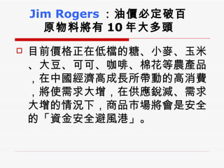 Jim Rogers 提出原物料市場将进入十年的牛市,认为油价将突破100美元,并预测糖、小麦、玉米等农产品的价格将有显著上涨。虽然黄金持续创新高,但他认为不是最佳投资选择,因为其供应稳定且缺乏短缺问题。同时,投资原物料相当于投资中国,未来中国经济将推动商品市场的增长。