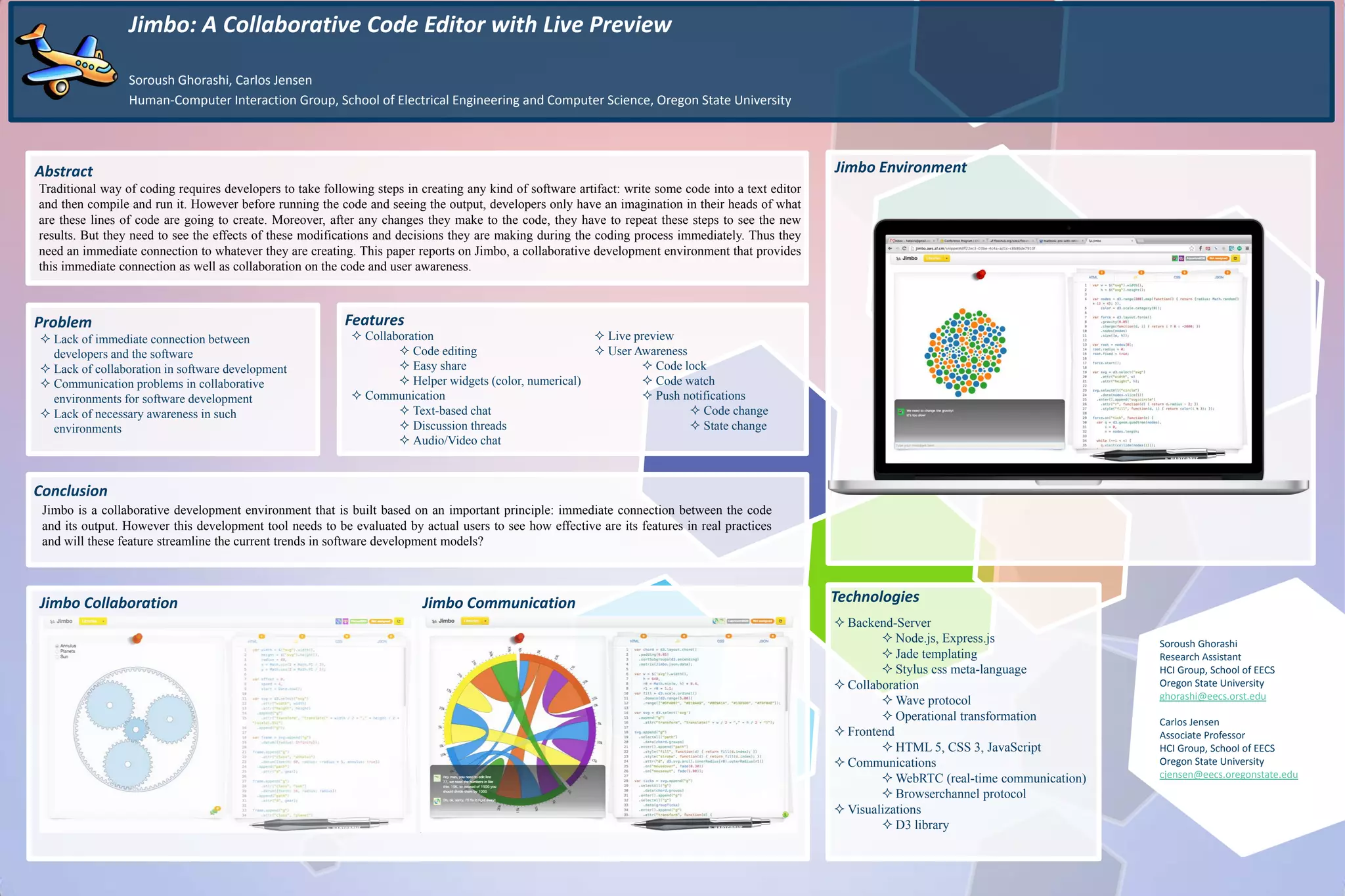 Jimbo is a collaborative code editor designed to provide immediate feedback and connection between code and its output, addressing inefficiencies in traditional coding practices. Key features include live preview, collaboration tools, communication options, and user awareness capabilities. The effectiveness of Jimbo's features needs to be evaluated through user testing to determine their impact on software development models.