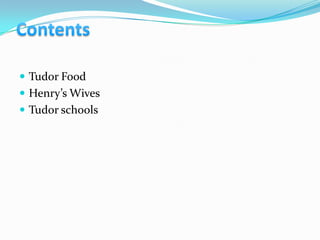 The document provides information on various aspects of Tudor life including food, the monarchs that ruled during this period, and schools. Tudor food varied between the rich who ate lots of meat and the poor who sometimes ate rotten meat hidden with spices. It also lists the kings and queens that ruled from Henry VII to Elizabeth I. Finally, it notes that rich children attended school daily and may have had a whipping boy take punishments for them, while poor children did not regularly attend.