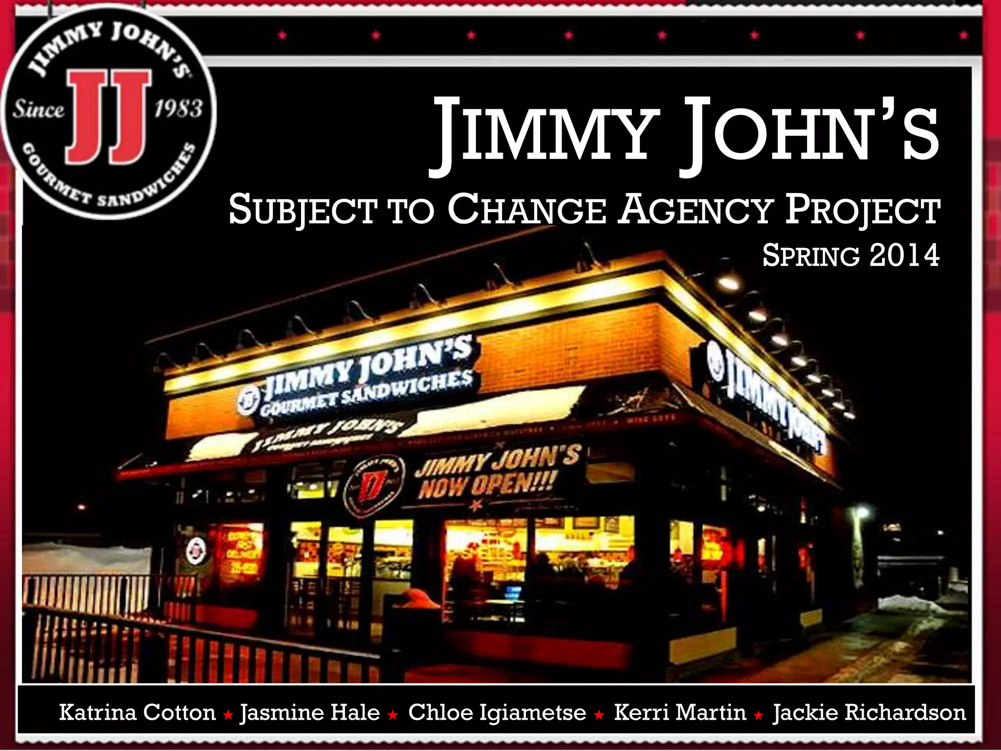 The Subject to Change Agency conducted research to help Jimmy John's expand its target market and appeal more to women. Through focus groups and surveys, they found that taste, quality, and price were most important to customers when choosing a sandwich shop. While JJ's advertisements were attention-grabbing, participants felt they should focus more on food options and visuals rather than speedy delivery. The agency recommended JJ's shift away from an emphasis on delivery speed and instead highlight new menu items, food quality, and special promotions in its marketing.