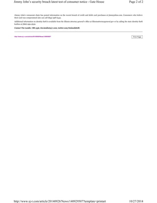 Jimmy John's announced in late September that customer payment card data may have been compromised in a security breach at over 200 of its stores between June and September. Illinois law requires companies to notify customers of credit and debit card breaches within a reasonable time. While Jimmy John's learned of the breach in late July, they did not publicly announce it until September. The Illinois Attorney General's office is investigating the breach at Jimmy John's to determine the source and appropriate response.