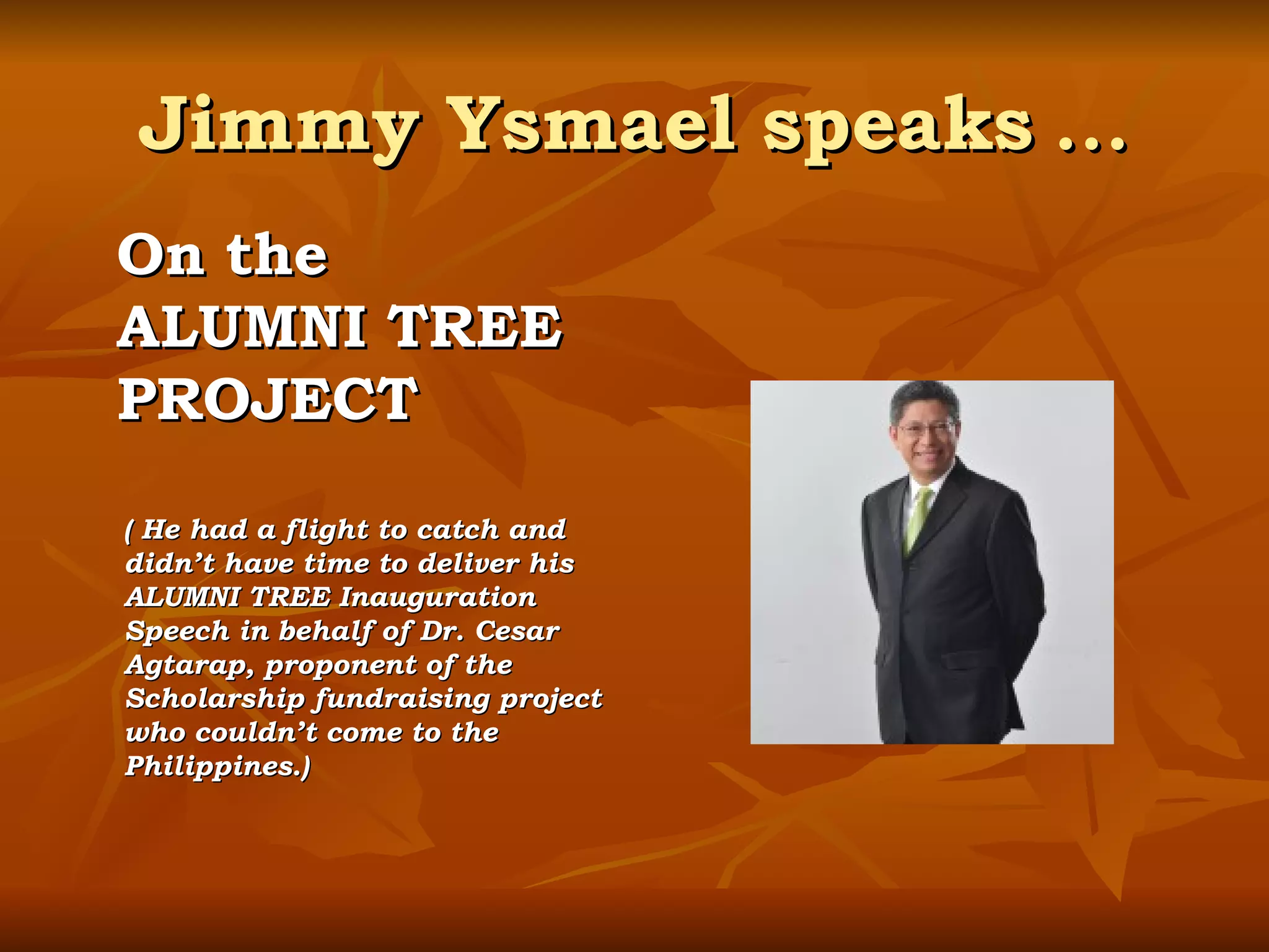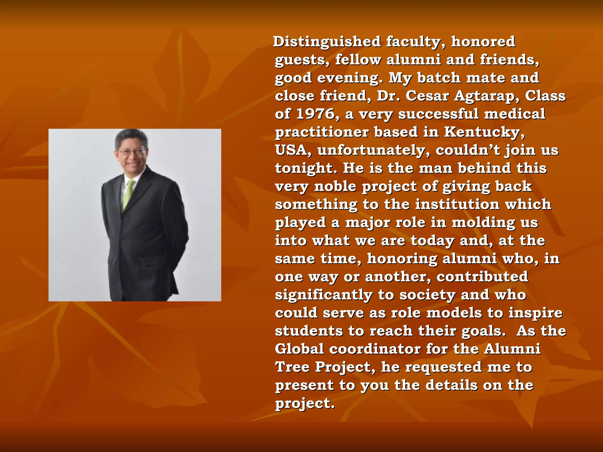 The Alumni Tree Project, initiated by Dr. Cesar Agtarap, aims to raise funds for scholarships and inspire students by honoring alumni contributions. This project recognizes the success of alumni by etching their names on metal leaves displayed on a tree at the school library and seeks donations to sustain its initiatives. The program targets deserving students from low-income families and offers them financial support, encouraging alumni to participate and contribute for the benefit of future generations.