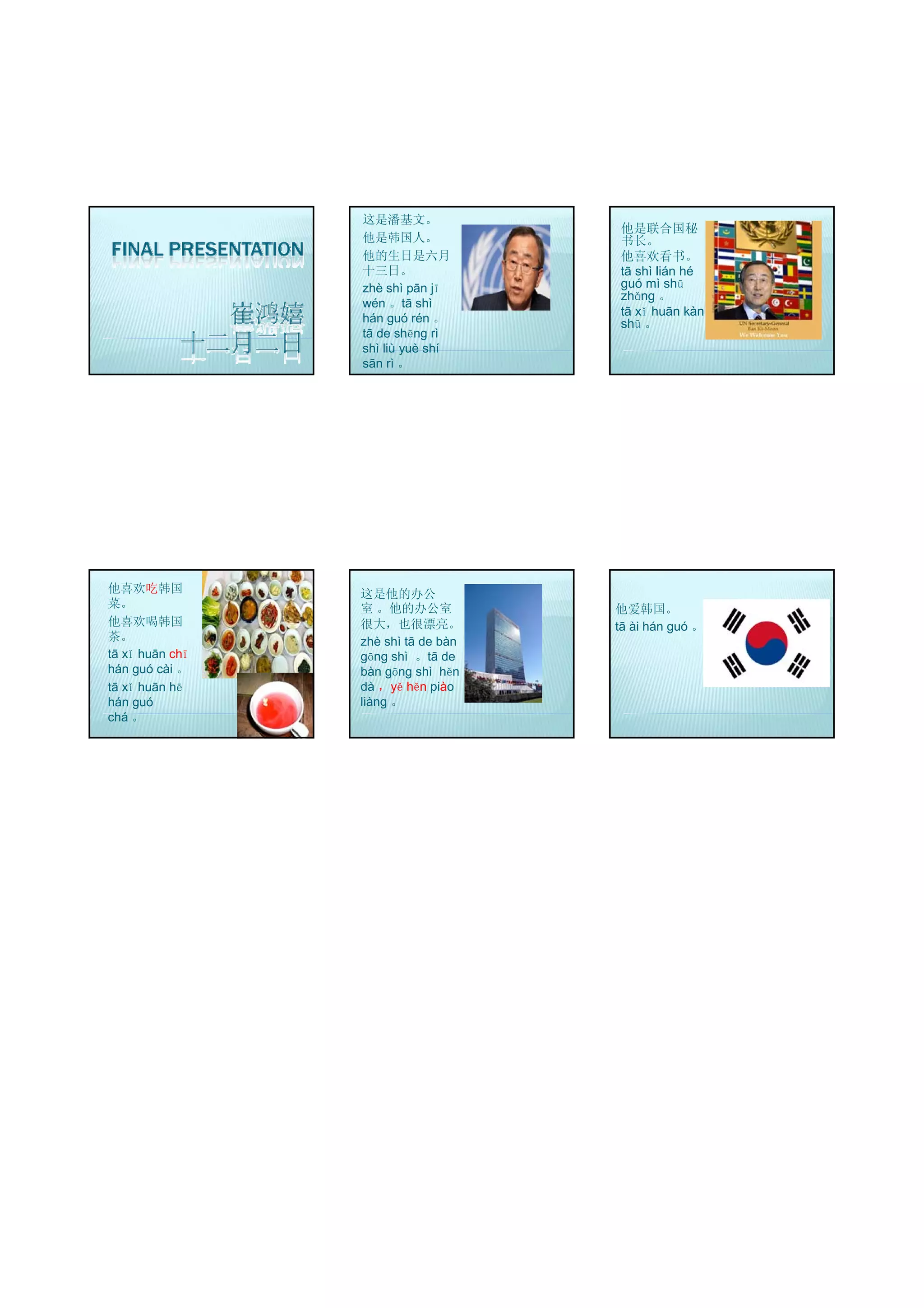 他是联合国秘 他是韩国人。 书长。 他的生日是六月 他喜欢看书。 十三日。 tā shì lián hé zhè shì pān jī guó mì shū zhǎng 。 wén 。tā shì tā xǐ huān kàn hán guó rén 。 shū 。 tā de shēng rì shì liù yuè shí sān rì 。 他喜欢吃韩国 这是他的办公 菜。 室 。他的办公室 他爱韩国。 他喜欢喝韩国 很大,也很漂亮。 tā ài hán guó 。 茶。 zhè shì tā de bàn tā xǐ huān chī gōng shì 。tā de hán guó cài 。 bàn gōng shì hěn tā xǐ huān hē dà ,yě hěn piào hán guó liàng 。 chá 。