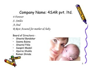4Sar Pvt. Ltd. is launching a unique 'buzzer diaper' with sensor technology aimed at easing parenting stress and ensuring baby comfort. The company's mission is to become a market leader in India within three years, focusing on product quality, customer satisfaction, and expansion into global markets. The initial capital investment is Rs. 1 crore, with a combination of partner investment and bank loans to support the venture.