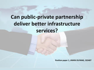 The document discusses public-private partnerships (PPPs) and their potential benefits and drawbacks for delivering infrastructure services. PPPs aim to leverage private sector expertise and financing to strengthen infrastructure quality and quantity while reducing costs and construction timelines. However, the prioritization of low costs over performance and potential conflicts between public and private sector goals may undermine value and public interests. The document also examines Hong Kong's successful PPP for its mass transit railway system as a case study.