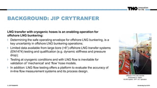 This document describes a proposed research collaboration called JIP CRYTRANSFER to study LNG bunkering with cryogenic hoses. The goals are to 1) develop a mechanical hose model to predict hose shape, deformation, and end fitting loads under different conditions, and 2) improve flow models to determine pressure drop and optimize hose diameter and flow rates. Participants will characterize hose stiffness through testing, develop a finite element hose model, and validate it on sample configurations. Flow testing will determine how friction coefficients vary with pressure and compare inline flow measurement tools. The research is organized by TNO and funded through industry and government sources.