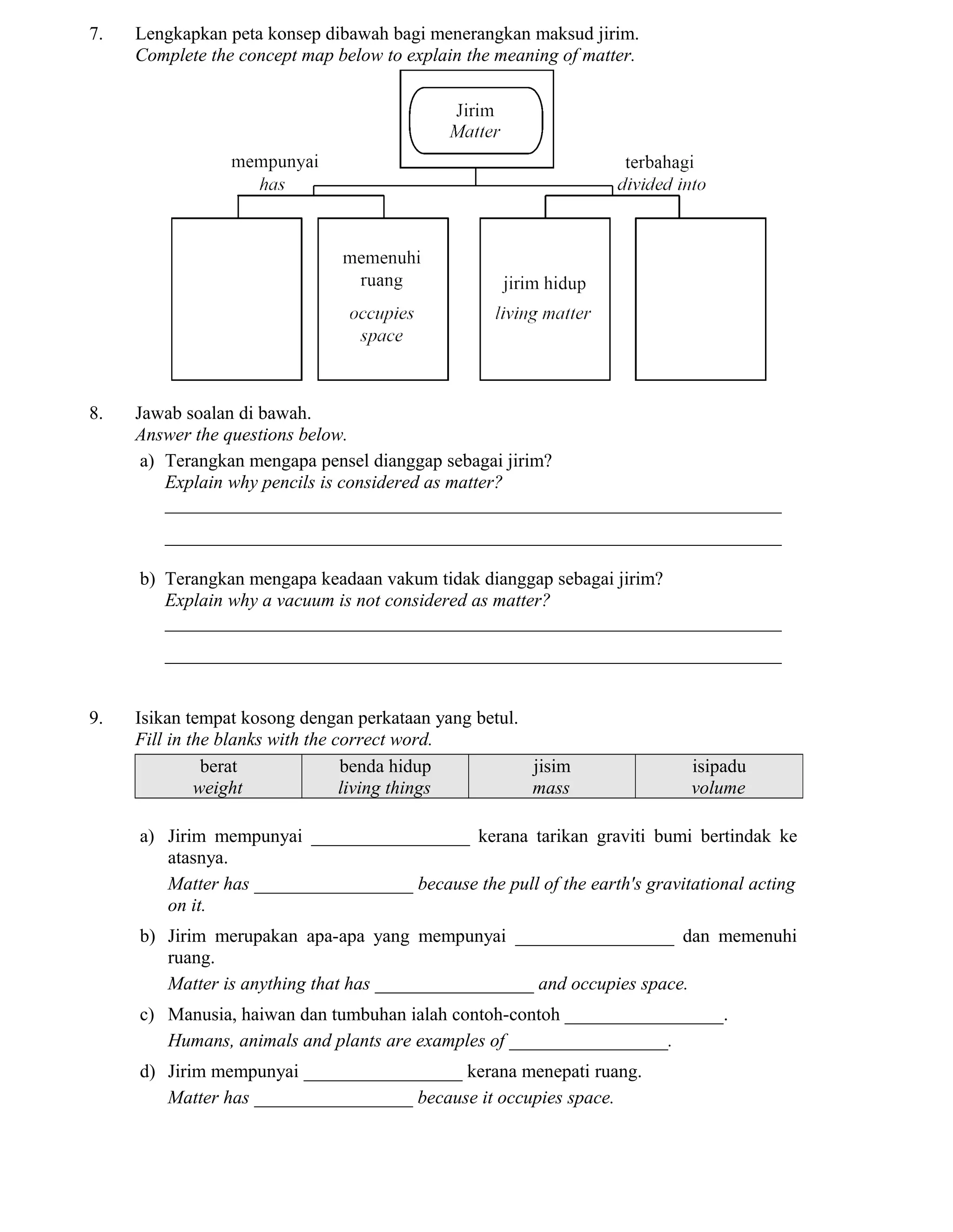 This document contains questions about matter and its properties. It asks the student to complete a concept map about matter, explain why pencils are considered matter but a vacuum is not, identify mass and volume in statements, classify examples as matter or non-matter, list examples to complete a concept map of matter and non-matter, and identify the state of matter for different substances. It also contains questions about comparing and contrasting mass and weight, and tools to measure them.