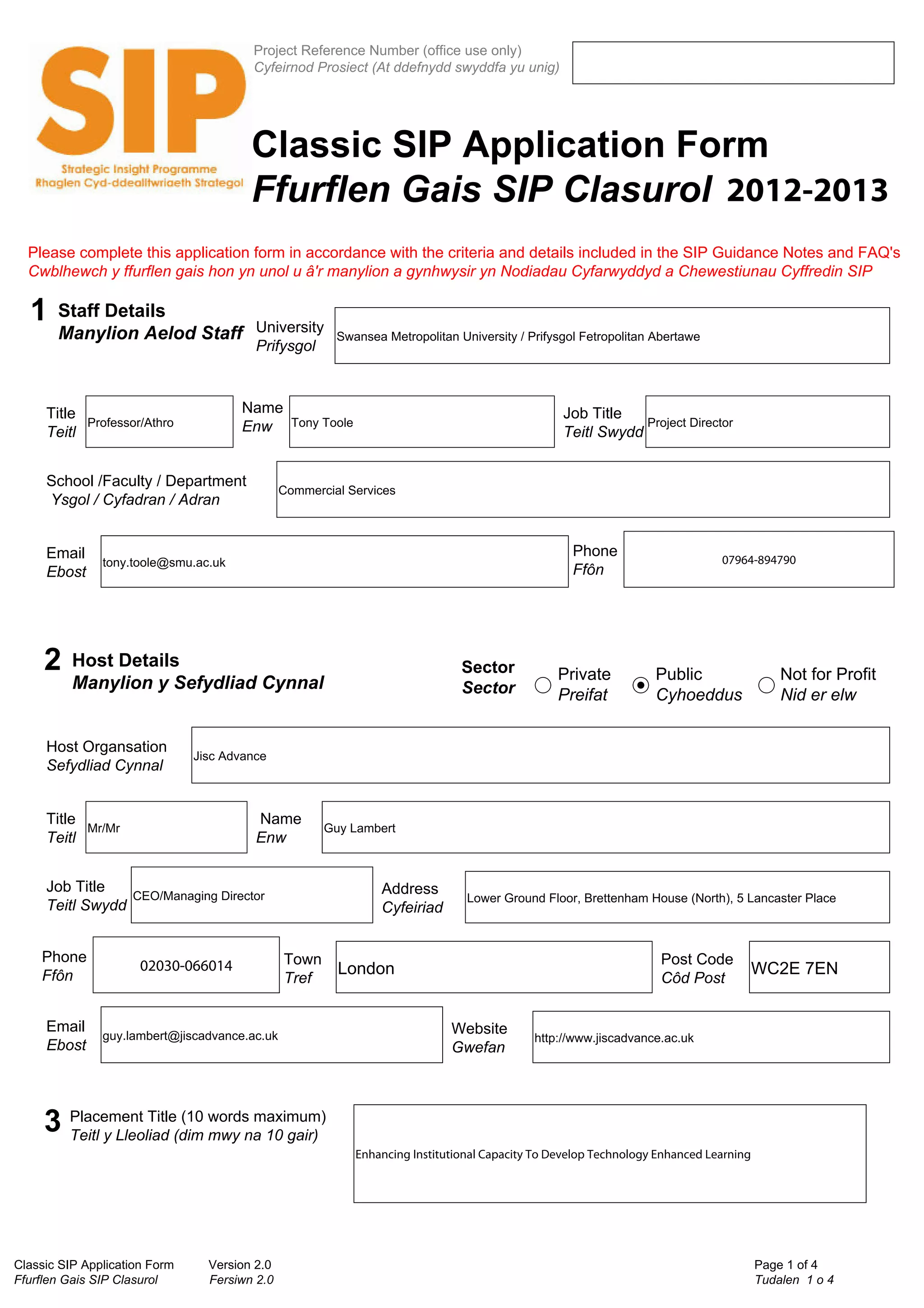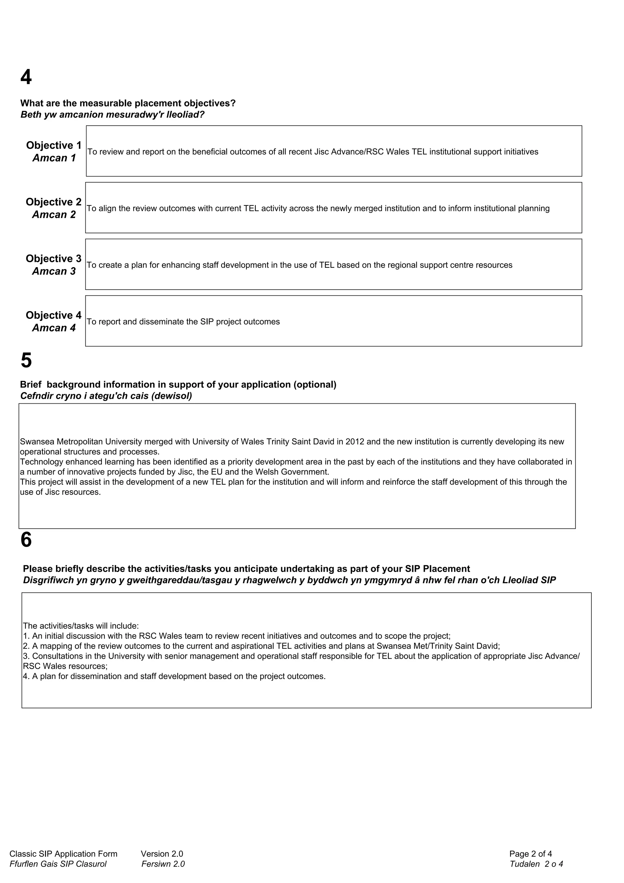 1) Professor Tony Toole of Swansea Metropolitan University is applying for a SIP placement with Jisc Advance to review outcomes of recent technology enhanced learning initiatives and align them with the merged university's plans.