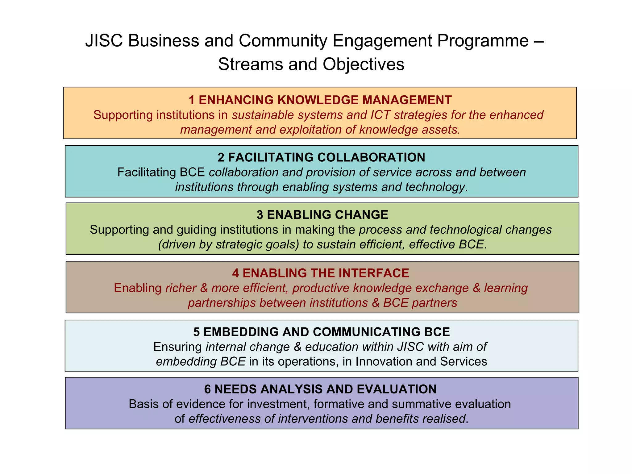 The document outlines 6 streams of the JISC Business and Community Engagement Programme along with their objectives: