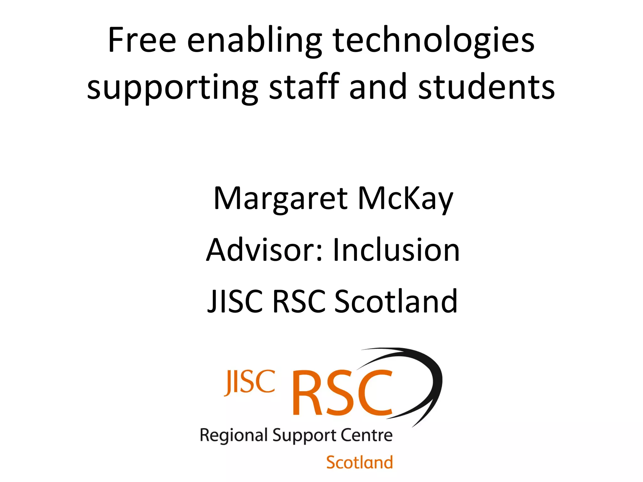 This document discusses free enabling technologies that can support staff and students. It provides information on technologies like text-to-speech, screen reading software, mind mapping tools, and spelling and grammar checkers. Case studies are presented on how these technologies have helped students and staff at South Lanarkshire College. Links are included to guides and video demonstrations of different free technologies.