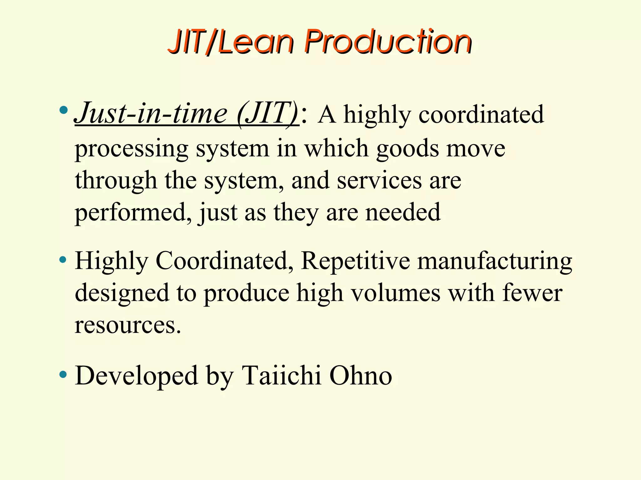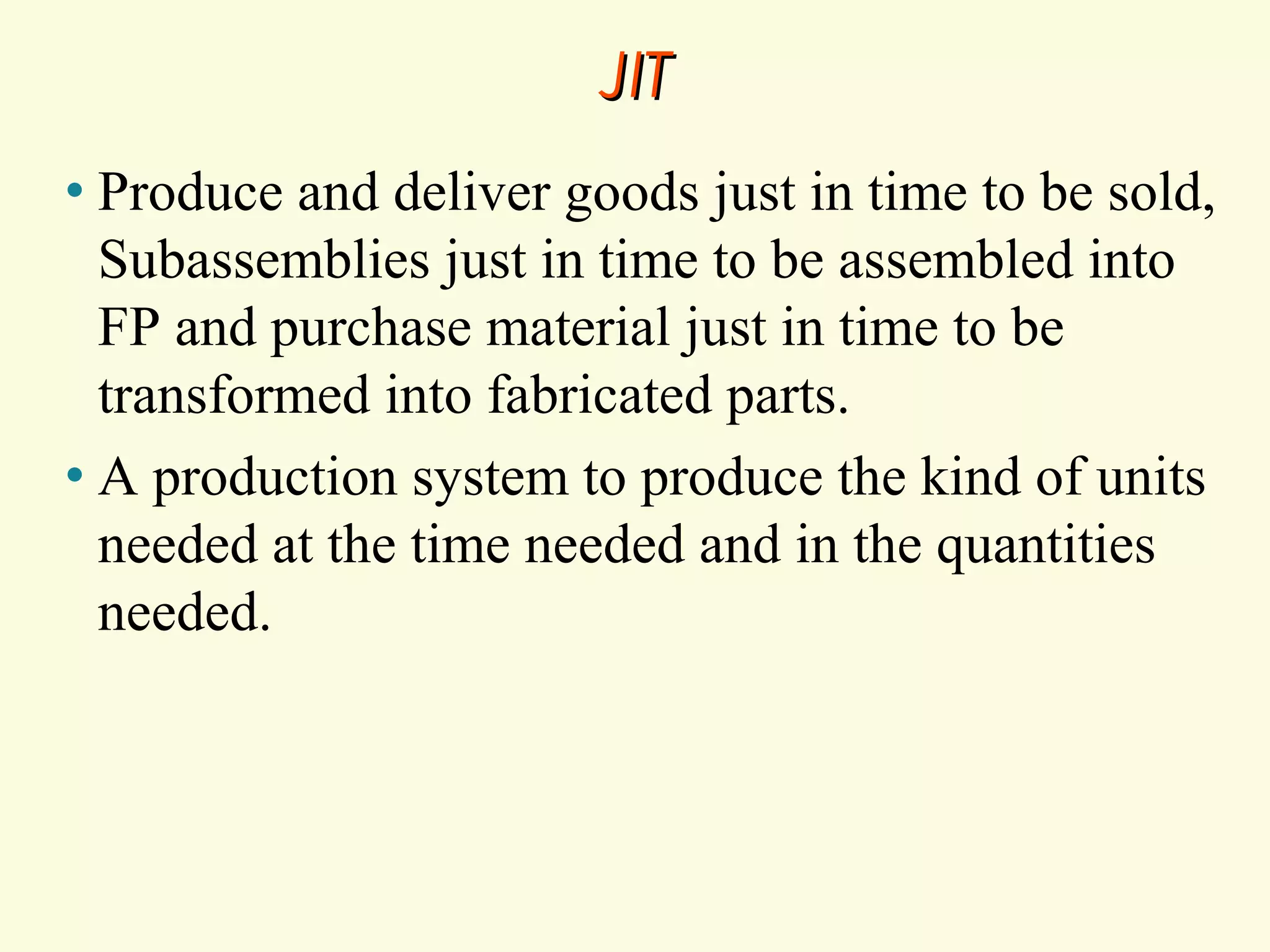 Just-in-time (JIT) production is a highly coordinated manufacturing system that produces goods and services just as they are needed. The ultimate goal of JIT is to achieve a smooth, rapid flow of materials through the production system with minimal inventories, waste, and transactions. Key elements of JIT include small lot sizes, continuous improvement, visual control systems like Kanban, and close supplier relationships. Benefits of JIT include reduced inventory levels, higher quality, flexibility, and increased productivity.