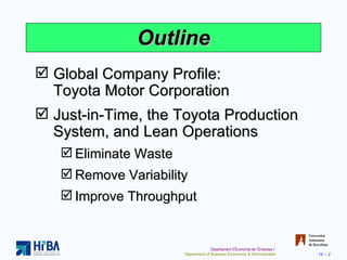 The document discusses operations management concepts related to just-in-time (JIT) and lean operations. It describes how Toyota Motor Corporation pioneered JIT and the Toyota Production System (TPS) to eliminate waste, reduce variability, and improve throughput. Key aspects of JIT/lean covered include minimizing inventory, reducing setup times and lot sizes, using level scheduling and kanban signals, and emphasizing continuous improvement.