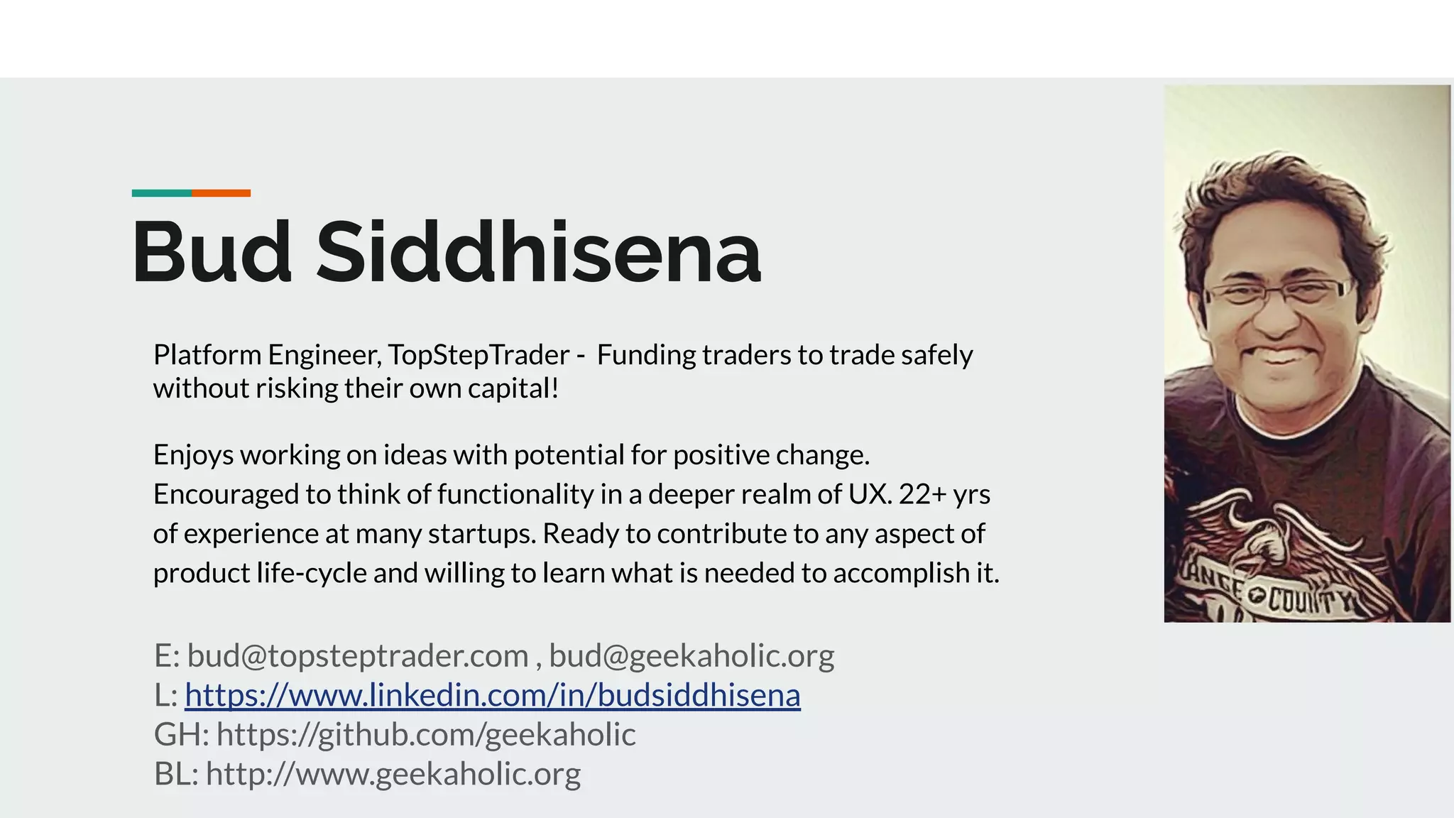 Bud Siddhisena is a platform engineer at TopstepTrader with over 22 years of experience in startups, focused on enhancing functionality and UX. He is developing a solution to automate the development and testing environment for feature branches, utilizing Docker, Terraform, and ECS. The project aims to streamline the QA testing lifecycle while isolating resources and simplifying infrastructure management.