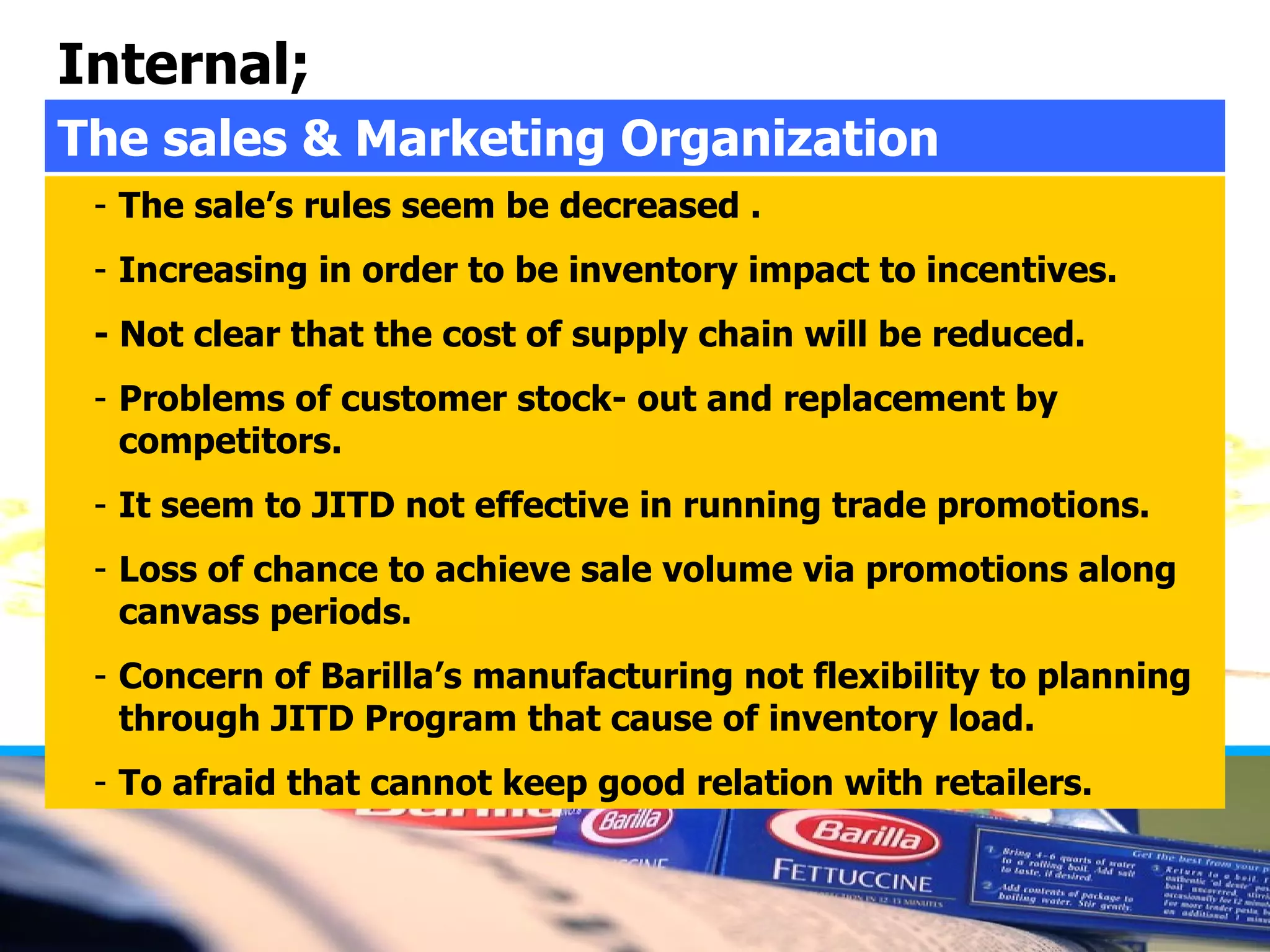 The document discusses concerns about implementing a Just-In-Time Delivery (JITD) program from the perspectives of internal sales/marketing and external distributors and retailers. Key concerns include the potential for decreased incentives, loss of sales from promotions, interrupted warehouse operations and inventory management, and decreased flexibility in manufacturing planning. The proposed focus is on educating stakeholders, implementing point-of-sale systems to prove benefits, incentivizing appropriately, and using shipment data to improve forecasting and manufacturing planning.