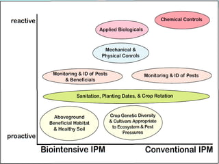 The document discusses Integrated Pest Management (IPM), which aims to manage pest populations below economically damaging levels through cultural, biological, and chemical practices. It defines IPM and outlines its objectives of reducing crop losses, pollution, and pesticide use while maintaining ecological balance. The document also discusses the various control methods used in IPM, including cultural, physical, biological and chemical controls, and provides examples of IPM programs and their benefits over non-IPM practices in reducing costs and protecting the environment.