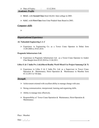The document is a resume for Jitendra Kumar Shahani. It summarizes his personal details such as name, address, contact information, date of birth, marital status, languages spoken and hobbies. It also lists his educational qualifications, work experience operating tower cranes and hoists for construction companies in Dubai and Mumbai between 2008-present. His skills include strong communication, time management and the responsibility of operating and maintaining tower cranes and hoists.