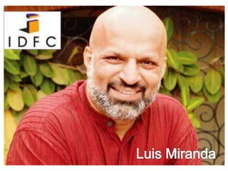 Luis Miranda is a former private equity executive who is now involved in various non-profit organizations and social initiatives in India. He previously served as Chairman of IDFC Private Equity but has since stepped down to focus on improving education and supporting women's issues through groups like SNEHA and Muktangan. Miranda also contributes to infrastructure development in India through involvement with companies such as GMR Infrastructure and L&T Infrastructure.