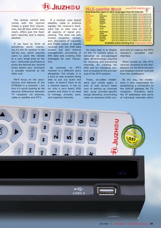 The document tests and reviews the Jiuzhou DTP8300 IPTV receiver. It summarizes the key differences between IPTV and traditional TV reception, noting that IPTV receivers do not process signals directly but instead act as web browsers to display streaming content from a middleware server. The review examines the DTP8300's design, connection and configuration options. It finds the receiver is easy to set up for either Ethernet or wireless network access and displays content smoothly from a test middleware installation.