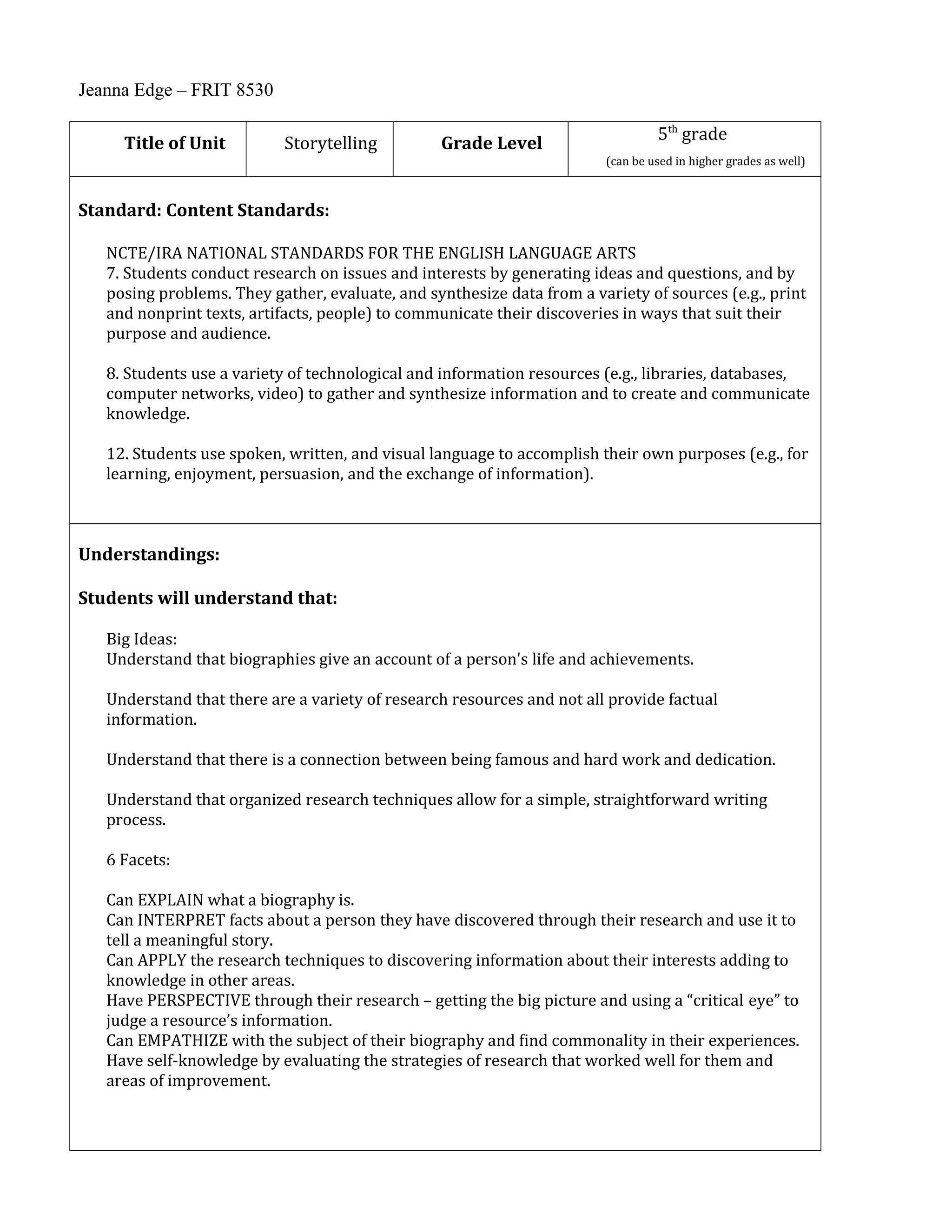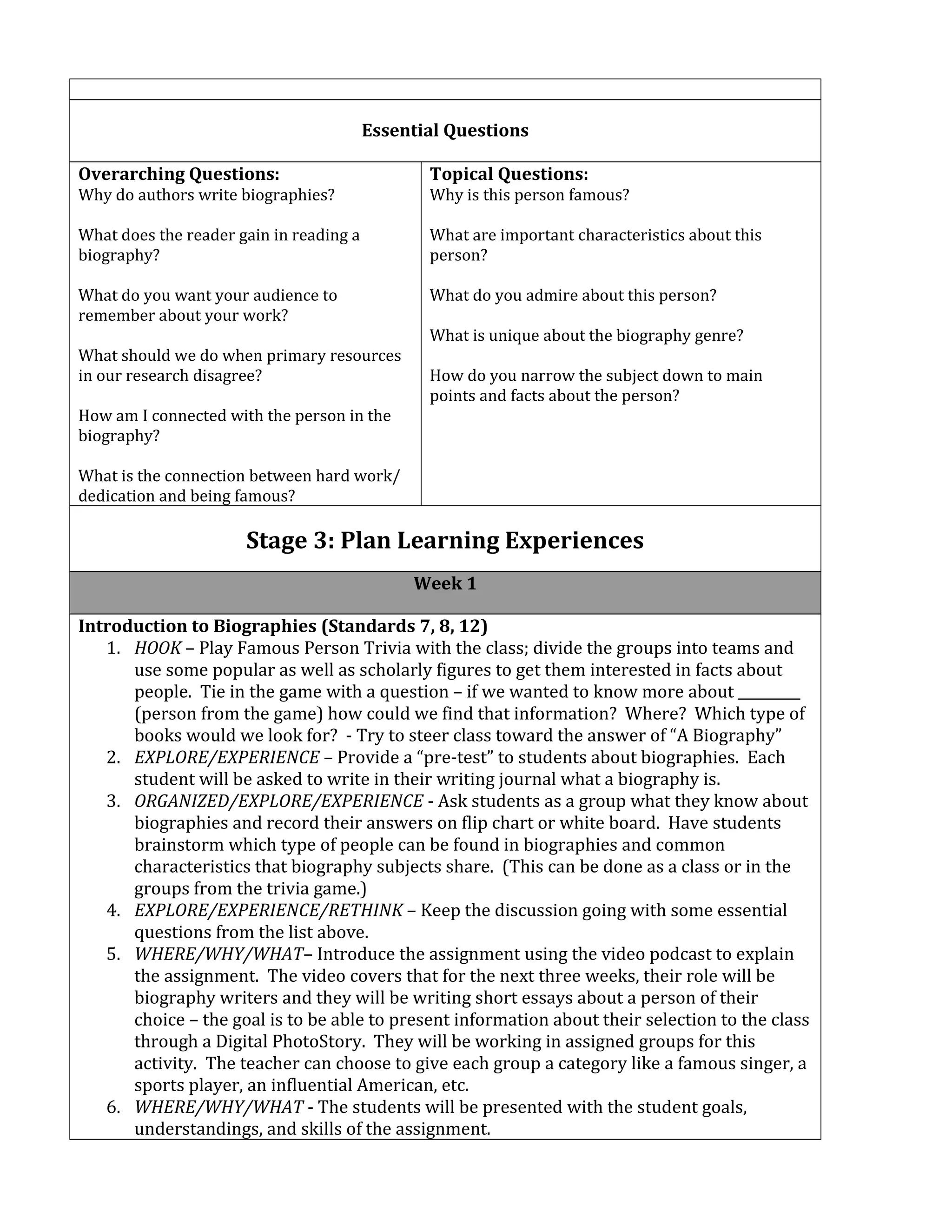 This document provides a unit plan for teaching 5th grade students about biographies. The unit spans 3 weeks and uses a project-based learning approach where students work in groups to research and create a digital photo story biography about a famous person. Key activities include an introduction to biographies, reviewing research resources, conducting research in the media center, outlining information, drafting and revising scripts, developing the digital stories in Photostory, presenting the stories, self-reflection, and a final review. The unit is aligned to national English language arts standards and incorporates modifications for differentiating instruction.