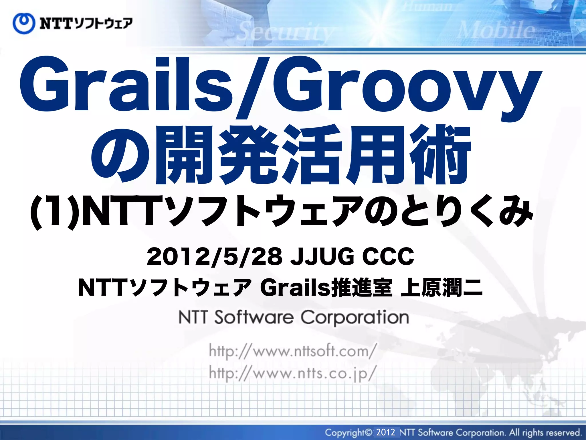 まとめ Javaを中心に開発してきたSIerである弊社 にとって、Groovy/Grails技術は「ほどほど の痛みで、大きな果実を得るための解」 「地続きの移行」を可能とする 今後、プラグイン活用によって更なる効果を期待 NTTソフトウェアは、コミュニティと連携 してGroovy/Grails技術の普及発展を目指し ます。