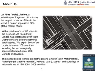 1) JK Files (India) Limited aimed to become the largest and best manufacturer of files in the world through redesigning operations, processes, and technology infusion to build world-class plants, de-skilled processes, and offer a wider range of high-quality products.
