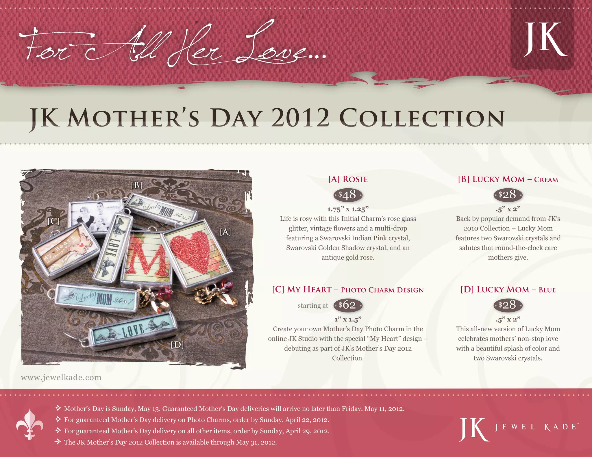 The JK Mother's Day 2012 collection features various charm designs such as 'Lucky Mom' and 'My Heart' with Swarovski crystals. The collection celebrates mothers' love and includes personalized photo charms, available online at JewelKade. Key ordering deadlines for guaranteed Mother's Day delivery are noted, with the collection available until May 31, 2012.