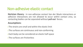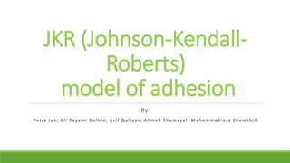 The document summarizes the Johnson-Kendall-Roberts (JKR) model of adhesion. The JKR model considers the effects of contact pressure and adhesion within the contact area between two elastic bodies. The model predicts that the contact area is larger than the Hertzian model when adhesion is present, and that there is a non-zero contact area even when the load is removed due to adhesion. The JKR model is commonly used to model adhesive contact and estimate surface energy from experimental data.