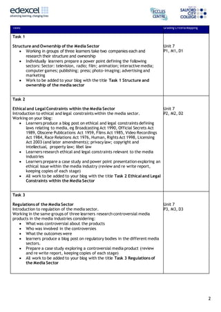 This document outlines the tasks and assessment criteria for a unit on understanding the creative media sector. The unit aims to give students an understanding of the sector's industries and their ownership structures, as well as legal and regulatory issues. For assessment, students will produce a blog with three posts: 1) defining the structure and ownership of different media sectors and companies, 2) exploring ethical and legal constraints in the media, and 3) examining regulatory bodies and a controversial media case study. The blog posts will be assessed based on criteria ranging from basic descriptions to comprehensive explanations with examples.