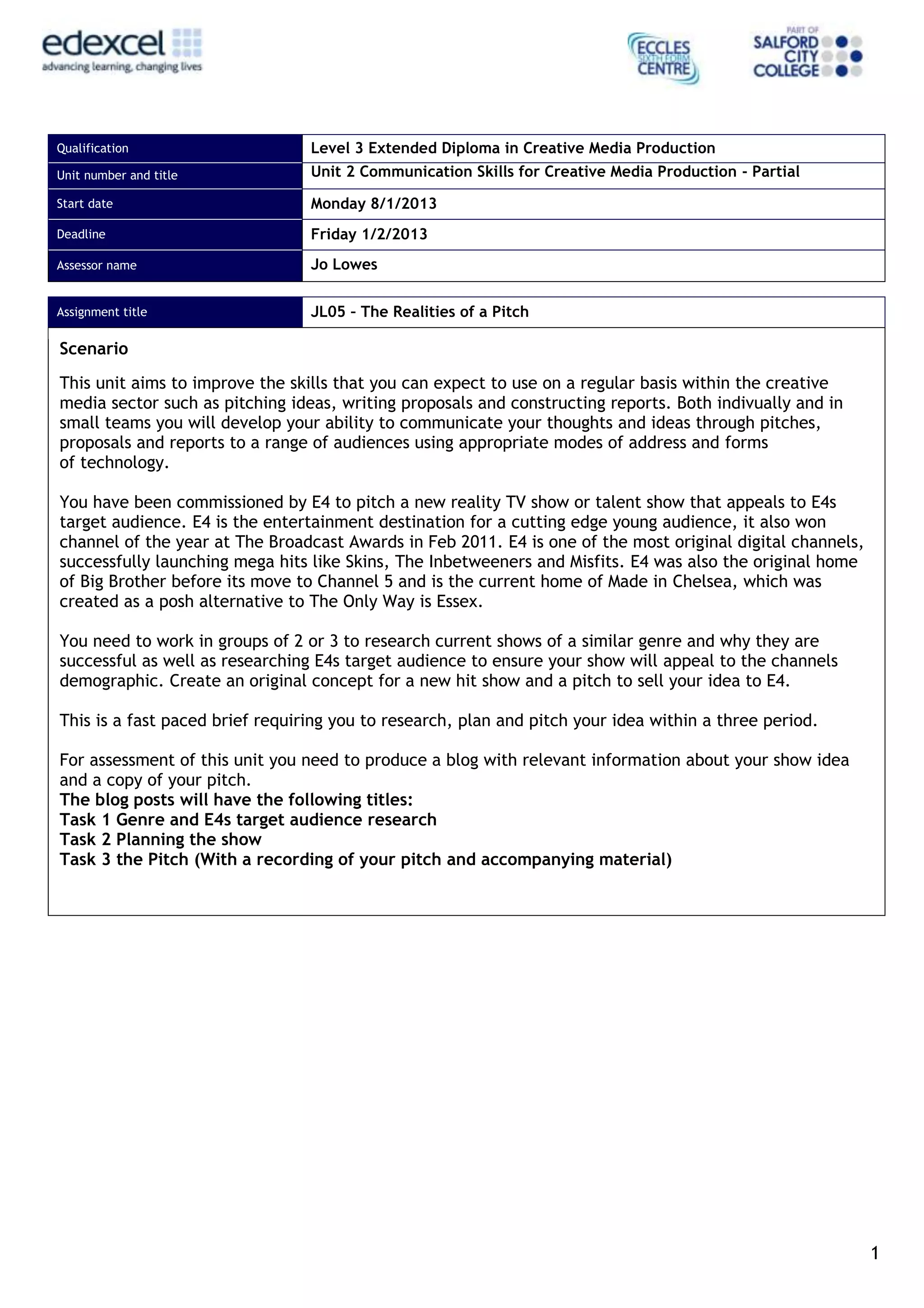 This document provides the details of an assignment for a Creative Media Production course. Learners will work in groups to research current reality TV shows and E4's target audience, develop an original reality TV show concept, and pitch their idea to a panel. They will document their work in a blog with three posts covering genre research, show planning, and their pitch. The assignment aims to improve communication skills like pitching and will be assessed based on criteria mapping to course learning outcomes and personal, learning, and thinking skills.