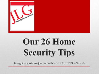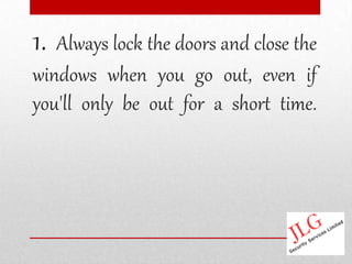 This document provides 26 home security tips, including locking doors and windows, using deadbolts, not hiding spare keys outside, using timers for lights/radios when away, installing security lighting, planting prickly shrubs around fences and walls, marking valuables, and joining a neighborhood watch program. Proper door and window locks, outdoor lighting, alarm systems, and secured tools/ladders can help deter burglars. Neighbors working together through community programs also enhances security.