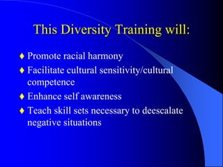 This three-session diversity training workshop aims to promote racial harmony and cultural competence. It will teach self-analysis, cognitive behavioral, and de-escalation techniques to participants. The goal is to provide a new way of thinking that heightens sensitivity toward others by helping participants understand themselves. The training is led by a clinical psychologist and professor and will use books, presentations and discussions to facilitate learning.