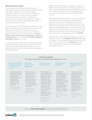 JLL is a commercial real estate firm that needed a way to help its professionals generate new business from existing clients and contacts, as many lacked formal sales training. Sales Navigator provided ways to discover connections to prospects within JLL's network, helping professionals leverage relationships to find new opportunities and shortening sales cycles. After deployment, JLL's Social Selling Index and sales performance increased significantly compared to competitors, helping the company identify over £1 million in new pipeline revenue opportunities.