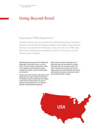 This document discusses the future of retail in the next decade. It argues that retailers will need to go beyond just selling tangible goods and instead focus on experiences to attract customers and compete with online retailers. Specifically, it predicts that retailers will need to provide entertainment, customer service, and create a sense of community to draw people to physical stores. The document also suggests that retailers can afford these enhanced experiences by finding new cost efficiencies, like outsourcing, and reinvesting the savings into the customer experience. Overall, retailers who want to thrive over the next 10 years will need to transform physical stores into destinations that offer compelling experiences and services, not just products.
