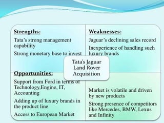 Ford announced in 2007 that it planned to sell Jaguar and Land Rover. Tata Motors and Mahindra & Mahindra emerged as top bidders and in 2008, Ford selected Tata as the preferred bidder. Tata completed the acquisition for $2.3 billion. Tata aimed to gain international distribution and a broader product range through the acquisition. Following the deal, Tata implemented cost rationalization measures like job cuts and extended supplier payment terms to improve Jaguar Land Rover's cash flows. While the financial crisis impacted luxury car demand, Jaguar Land Rover became profitable again by 2010 and is now seen as a successful acquisition.