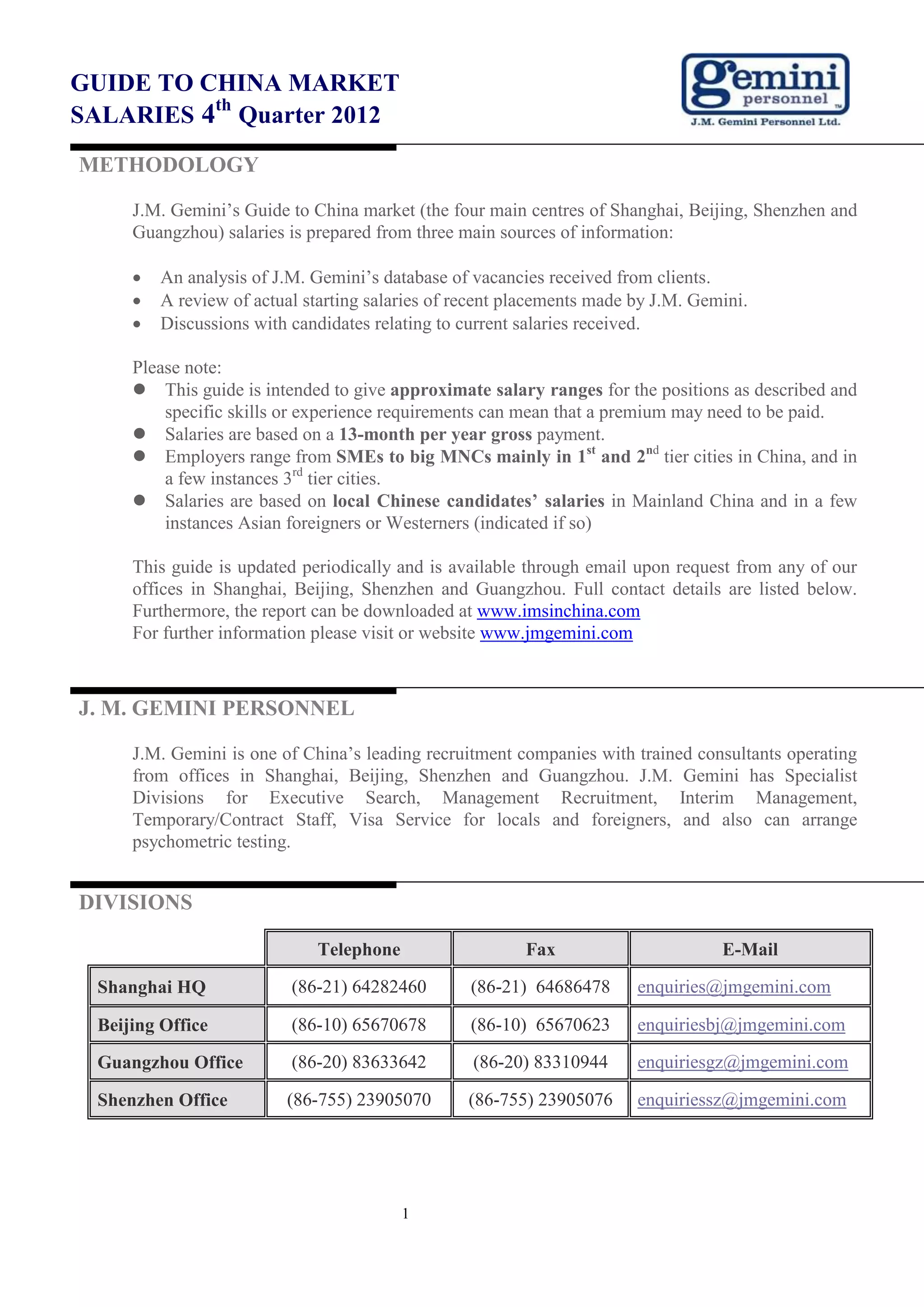 This document provides salary ranges in China for a variety of positions across different industries such as administration, finance, merchandising, banking, HR, logistics, legal, media, sales, IT, manufacturing, consulting and more. The salary ranges are based on data from job vacancies, placements, and candidate discussions. Contact information is provided for J.M. Gemini recruitment offices in major Chinese cities to obtain further salary guides or recruitment services.
