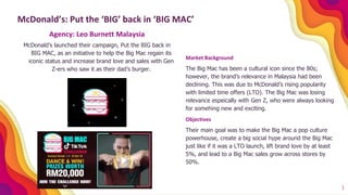 McDonald's launched a campaign called "Put the BIG back in BIG MAC" to regain popularity for their Big Mac burger among younger generations who saw it as outdated. They encouraged people to remix and build the Big Mac in creative ways on TikTok, generating viral popularity. This increased Big Mac sales by 83% and brand love by 6%. KFC used an influencer character called "Mat Ayam Free" to promote their "Colonel's Month" deal and reconnect with teens after price hikes damaged their brand. Mat Ayam photoshopped himself with celebrities, gaining over 20 million impressions. Sales rose 12.6%. M&M's "Battle for Fun" campaign partnered with an esports league to