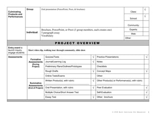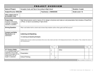 The document outlines a 2-week high school senior project where students work in groups to design a brochure and PowerPoint presentation on tips for succeeding in high school, addressing what work habits help students achieve their goals. Students will develop short and long-term goals, create a brochure and presentation, and participate in formative and summative assessments including quizzes, presentations, and essays.