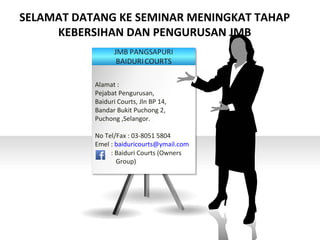 Dokumen ini adalah tentang seminar pengelolaan kebersihan dan pemeliharaan di Pangsapuri Baiduri Courts, yang terletak di Puchong, Selangor. Ia menjelaskan latar belakang pangsapuri, organisasi Jawatankuasa Pengurusan Bersama (JMB), dan tindakan untuk mengatasi masalah seperti tunggakan yuran dan isu keselamatan. Selain itu, terdapat juga penambahbaikan kemudahan serta perancangan aktiviti bersama antara JMB dan penduduk.